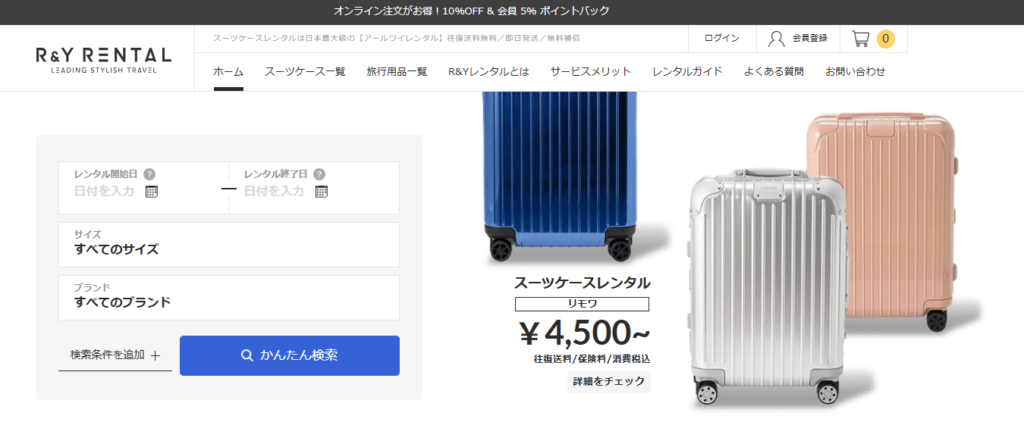 R&Yレンタルは、高級ブランドスーツケースの豊富な品揃えと手厚い補償が魅力のサービスです。リモワやサムソナイトなど有名ブランドの取り扱いが豊富で、最新モデルもいち早く導入されます。全品クリーニング済みで清潔さも高評価。
